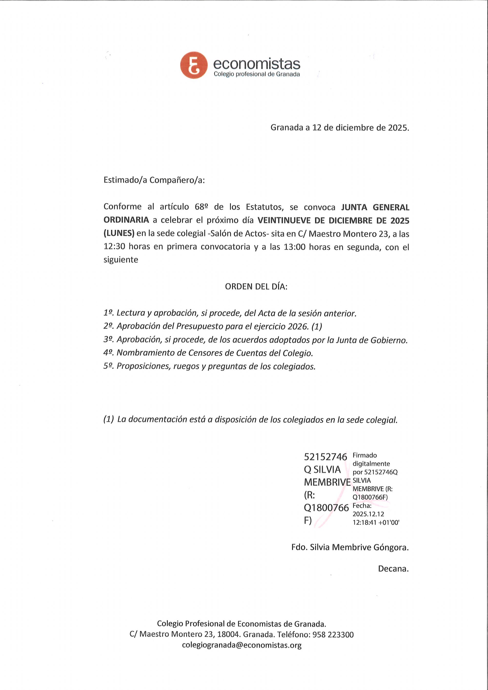 CONVOCATORIA JUNTA GENERAL ORDINARIA - 29.12.2025