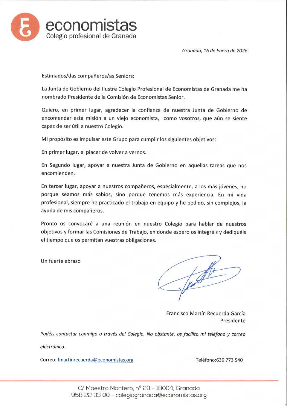 Francisco Martín-Recuerda ha sido nombrado Presidente de los Economistas Seniors de Granada.