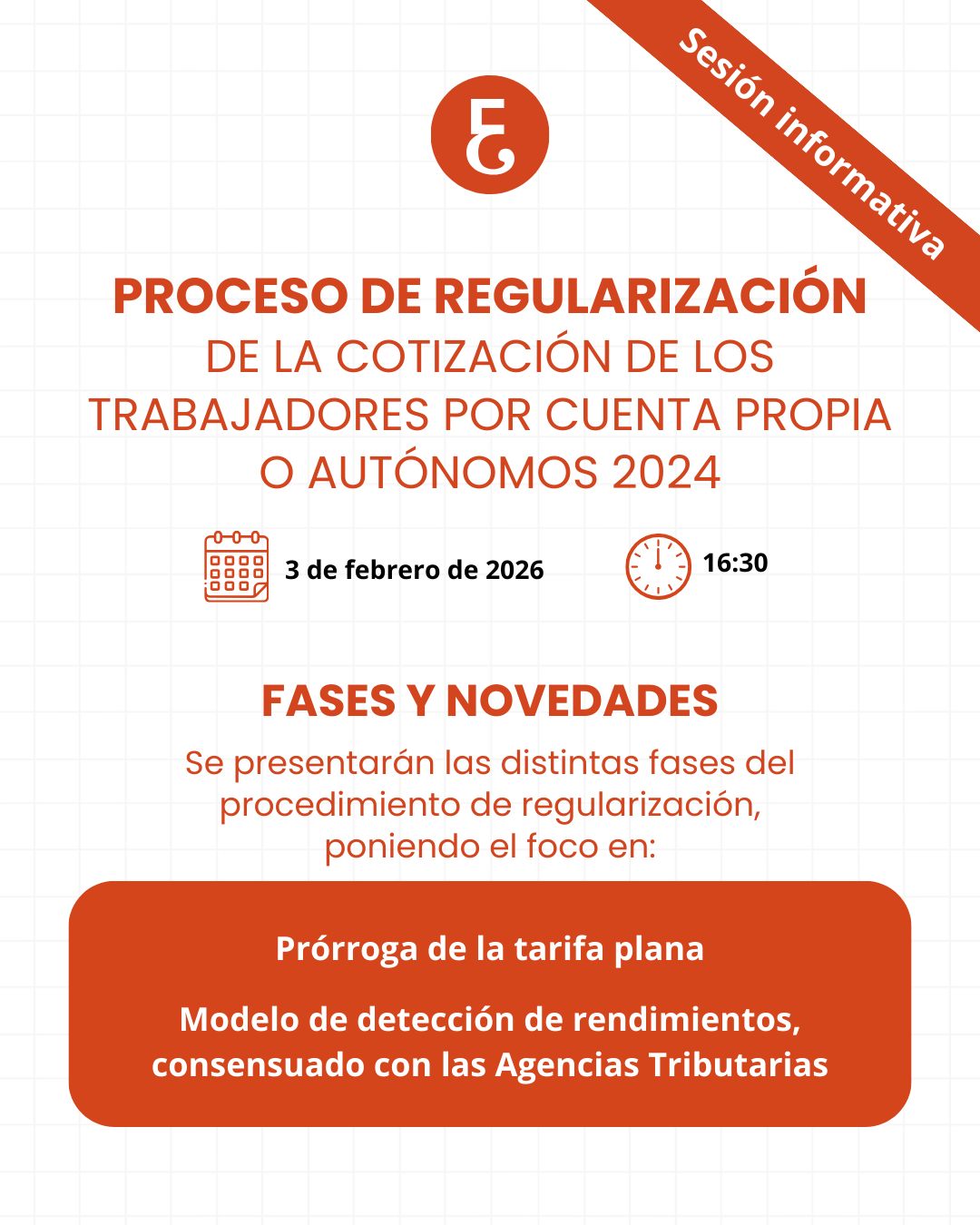 El próximo martes, 3 de febrero a las 16:30 horas celebraremos una sesión informativa sobre el proceso de regularización de la cotización de los trabajadores por cuenta propia o autónomos 2024.